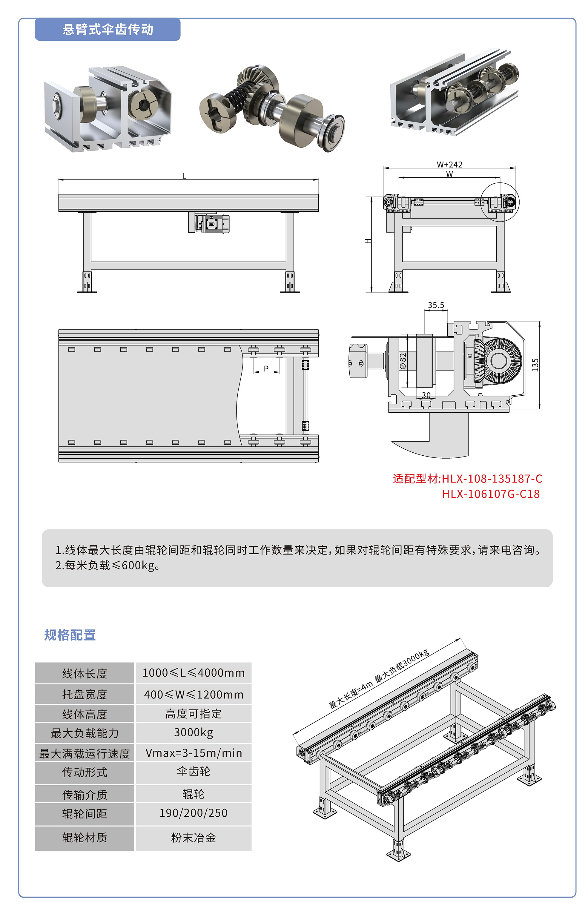采用135187鋁型材,傘齒驅(qū)動(dòng),粉末冶金滾輪鑲嵌銅套實(shí)現(xiàn)積放功能,負(fù)載3000kg/米,最大負(fù)載速度15M/min, 輪距190、200、250可選,適用托盤(pán)寬度400-1200mm,線體長(zhǎng)度范圍1000-4000mm, 高度根據(jù)需求定制.