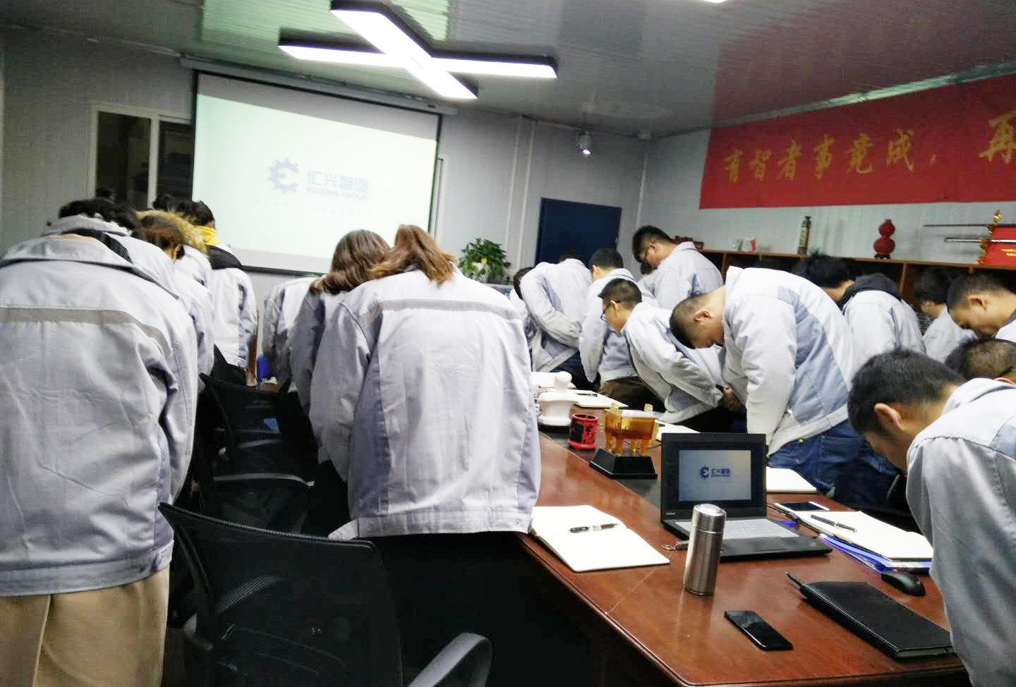 長(zhǎng)風(fēng)破浪會(huì)有時(shí),直掛云帆濟(jì)滄海。12月21日晚,我司全體人員在匯利興學(xué)校召開十一月份月度會(huì)議,會(huì)議進(jìn)場(chǎng)依次由自我價(jià)值估秤及簽到入場(chǎng),由張副總主持。 全體員工觀看公司相關(guān)視頻及聆聽匯利興之歌 全體人員宣導(dǎo)企業(yè)理念并向企業(yè)三道(人道、孝道、商道)行三鞠躬 會(huì)上,首先依次例行對(duì)每月度最佳部門及個(gè)人的選舉及頒發(fā)獎(jiǎng)金;其次胡總經(jīng)理發(fā)表講話,表示到2017年12月28-30日進(jìn)行年度盤點(diǎn),然后談到公司前進(jìn)的步伐、隊(duì)伍的壯大,并表示大家在一起努力工作是難能可貴的,同時(shí)進(jìn)一步談到2018年度員工相關(guān)福利事宜等。最后張副總作相應(yīng)總結(jié),談到公司在大家共同的維護(hù)及努力下,更加的規(guī)范并表示相信大家在后面的工作中會(huì)更加的努力。 月度部門物控部主管徐財(cái)華(圖左)與胡總經(jīng)理(圖右)同框合影 月度之星胡前敏、姜英(圖右)與胡總經(jīng)理(圖左)同框合影