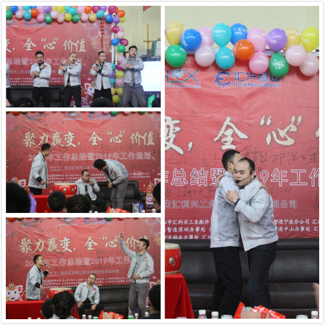 《開門紅》舞蹈 緊接著是一場(chǎng)聽覺的盛宴,胡總和胡前敏家人帶來(lái)的詩(shī)朗誦,貫穿著唯美的中國(guó)風(fēng)韻,溫和而又親切的聲音屢現(xiàn)耳旁,字里行間都展示了感恩之心的重要性。 小品《推銷》,銷售部家人演繹的惟妙惟肖,穿插著銷售部全體家人精神面貌,一聲聲“為夢(mèng)想沖刺,我是匯利興的一名忠誠(chéng)戰(zhàn)士”,現(xiàn)場(chǎng)士氣高昂、力量雄厚;從側(cè)面展示了雖一路挫折無(wú)數(shù)坎坷無(wú)數(shù),但決不放棄的信心與理念,并將公司精神面貌鮮活的展現(xiàn)在眾人面前,為他們點(diǎn)贊! 點(diǎn)燃全場(chǎng)的一曲《相親相愛一家人》,物控部每位家人相互搭肩,每個(gè)人都唱出了自己的心聲,我們是一家人,相親相愛的一家人,希望家人們?cè)?019年不忘初心,再出發(fā)。