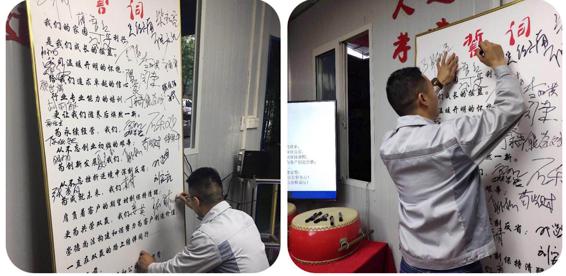會(huì)議第二項(xiàng)議程,企業(yè)文化的展示。全體匯興人整肅衣冠對(duì)匯興人倍加推崇的“三道文化”(孝道、商道、人道)鄭重地鞠躬,莊嚴(yán)宣誓企業(yè)愿景:“成為全球領(lǐng)先的智能自動(dòng)化產(chǎn)業(yè)鏈集成服務(wù)商”,企業(yè)使命:做受尊敬的好人,造受尊敬的產(chǎn)品,辦受尊敬的企業(yè),建受尊敬的平臺(tái),企業(yè)精神“用情做人、用心做事”,團(tuán)隊(duì)精神“忠誠(chéng)團(tuán)結(jié)、勤奮進(jìn)取”,工匠精神:創(chuàng)于手、精于工、智于器、匠于心、品于行,行為準(zhǔn)則:口中有德、目中有人、手中有技、心中有愛、行中有善,職業(yè)準(zhǔn)則:對(duì)工作熱臉、對(duì)同事笑臉、對(duì)錯(cuò)誤紅臉、對(duì)浪費(fèi)黑臉、對(duì)榮譽(yù)爭(zhēng)臉。隨后二位核心精英擊士氣鼓,士氣比武器更重要,現(xiàn)場(chǎng)氣氛熱烈、振奮人心。