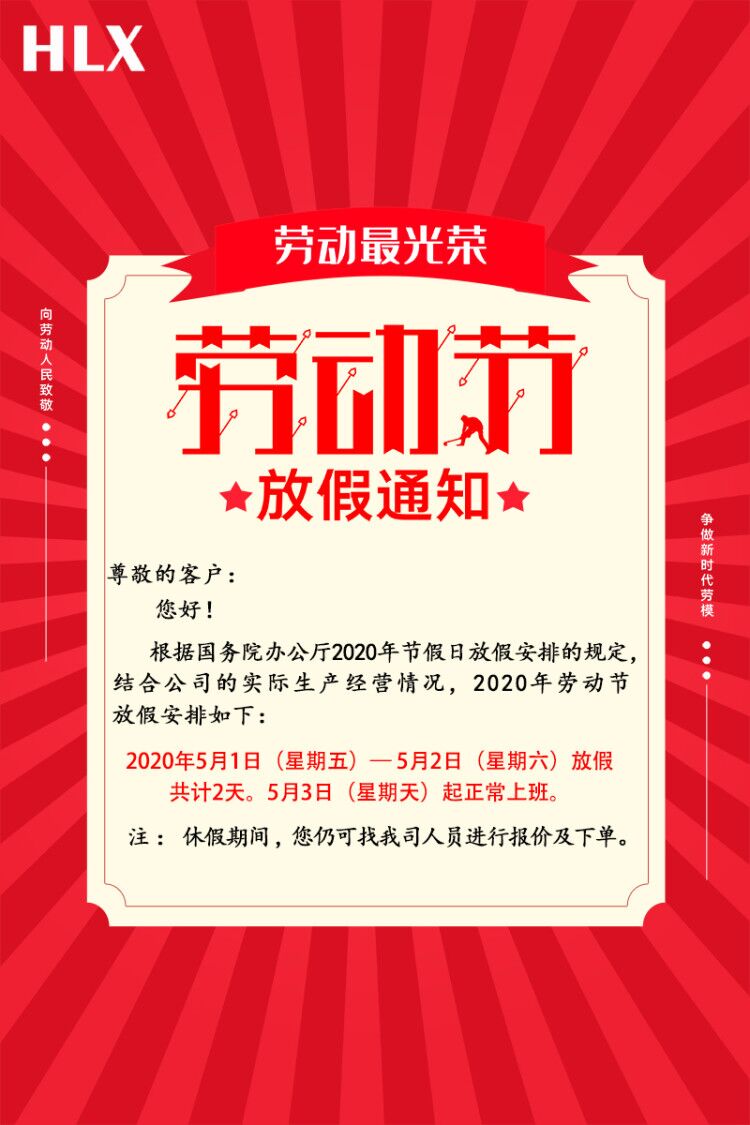 尊敬的客戶: 您好! 根據(jù)國(guó)務(wù)院辦公廳2020年節(jié)假日放假安排的規(guī)定,結(jié)合公司的實(shí)際生產(chǎn)經(jīng)營(yíng)情況,2020年勞動(dòng)節(jié)放假安排如下: 2020年5月1日(星期五)— 5月2日(星期六)放假,共計(jì)2天。5月3日(星期天)起正常上班。 放假期間,為避免發(fā)貨延遲請(qǐng)?zhí)崆白龊糜唵伟才?。由此給您帶來(lái)的不便,敬請(qǐng)諒解!