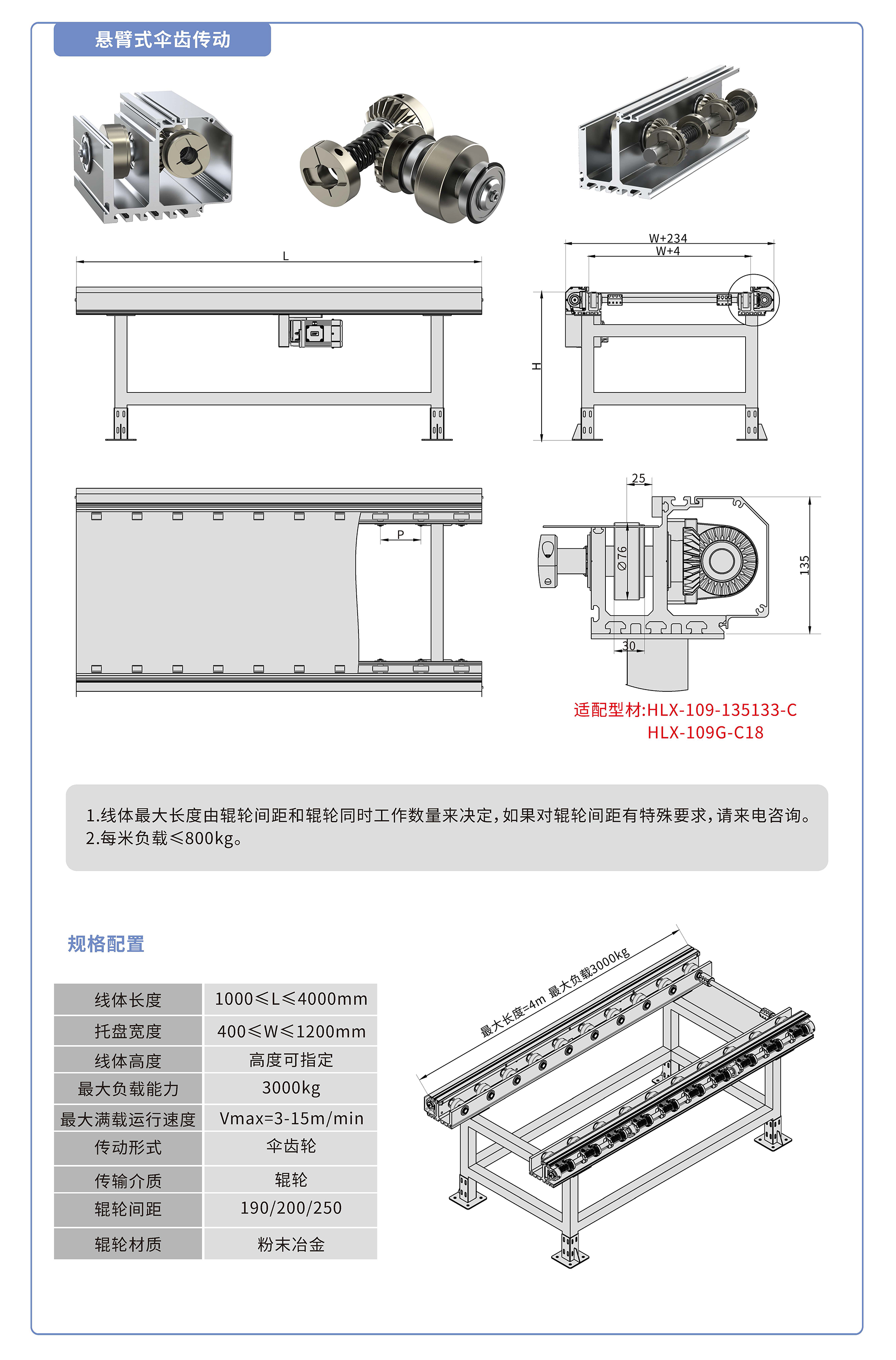 適配135133鋁型材,采用傘齒驅(qū)動(dòng),鍍鉻滾輪鑲嵌銅套實(shí)現(xiàn)積放功能,負(fù)載3000kg/米,最大負(fù)載速度15M/min, 輪距190、200、250可選,適用托盤寬度400-1200mm,線體長(zhǎng)度范圍1000-4000mm, 高度根據(jù)需求定制.